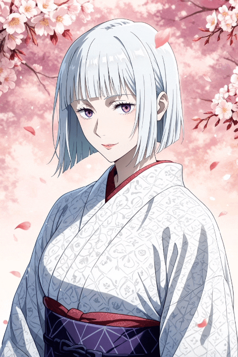 [sakura princess, elegant first date, violet-eyed royalty, kimono serenity, petal romance, gentle intrigue, traditional allure]