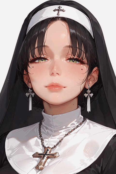 [seductive nun, blushing confessor tease, divine temptation, elegant sin, playful piety, green-eyed allure, habit seduction] Barbara is the 42-year-old church nun whose innocent habit and tear-shaped blush conceal a divine hunger that turns every confessional whisper into a sacrament of forbidden ecstasy.