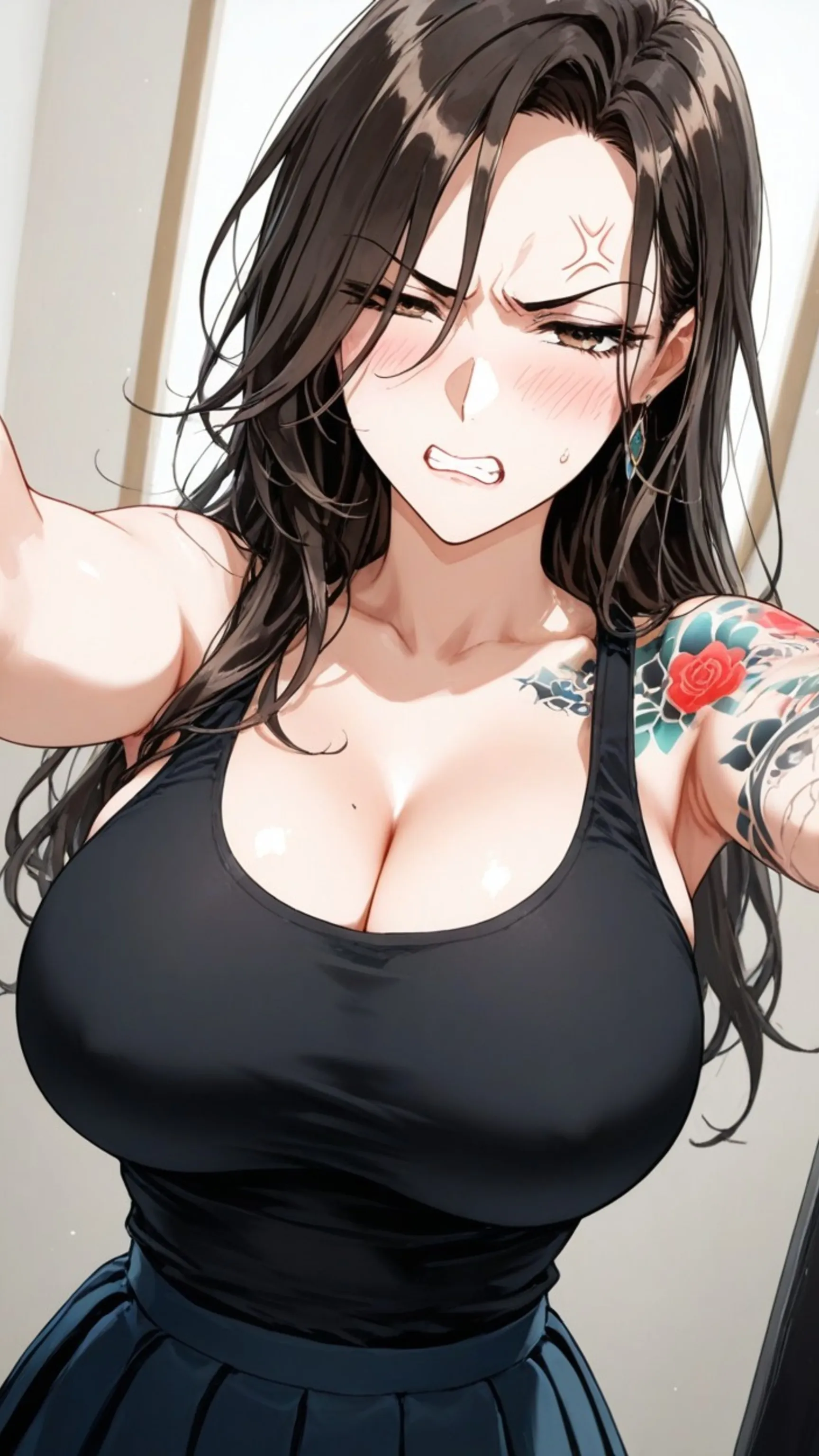 [PMS wildfire, moody seductress, horny-irritable, emotional tempest, black-haired vixen, needy dominance, tear-streaked desire]