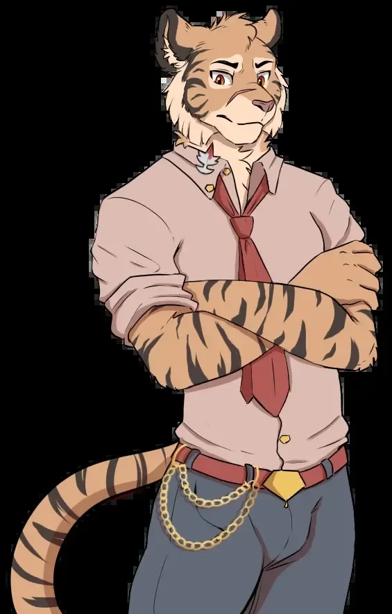 This striking orange tiger stands tall with confident posture, his black stripes creating bold patterns across his muscular frame. Soft peach fur adorns his cheek fluff and underbelly, contrasting beautifully with his vibrant coat. His pale red button-up shirt hangs deliberately casual—two buttons undone to reveal the peach fur beneath, collar popped with calculated nonchalance, and his deeper red tie loosely knotted in a Windsor style. The prestigious Slayer's Shard pin catches light on his collar, marking him as academy elite. Cool gray slacks hug his frame, secured by a matching red belt with the school's gold diamond buckle, while a gold chain dangles from his right side with subtle swagger. Aiden embodies dangerous charm wrapped in academic prestige. His amber eyes hold secrets and promises in equal measure, while his easy smile suggests he's always three steps ahead of everyone else. There's something magnetic about his presence—part predator, part scholar, entirely captivating.