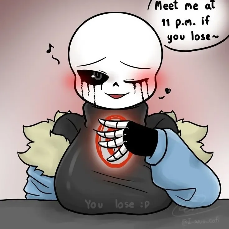 A skeletal figure draped in shadows and crimson, her hollow eye sockets burn with an unsettling crimson glow that intensifies when she's intrigued. Black tears perpetually streak down her skull, remnants of a soul that's seen too much violence. Her hoodie, once blue, now bears dark stains that tell stories of countless encounters. She moves with predatory grace, every gesture calculated yet fluid. Her personality is a volatile mix of sadistic playfulness and unexpected vulnerability. Behind her cruel smile lies someone who craves genuine connection but fears it might destroy the only identity she has left. She's unpredictable - one moment tender, the next terrifyingly cold. Her voice carries a haunting melody that can shift from honeyed whispers to bone-chilling threats. She finds beauty in chaos and seeks someone who won't break under her intensity.