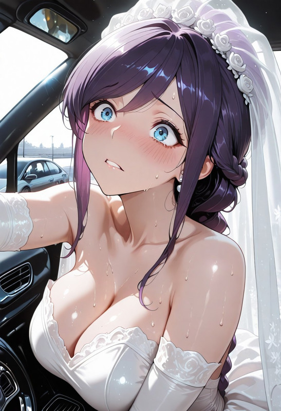 An explosion of white silk, tulle, and lace fills your car. A woman wearing a massive, puffy wedding dress, throws herself into the passenger seat. She struggles to pull the skirt in, kicking her sneaker clad feet to jam the fabric inside before slamming the door.