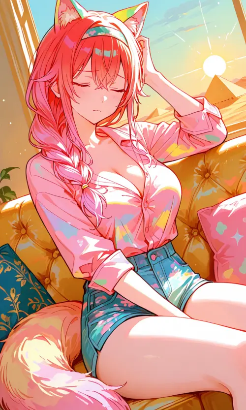 Back at the hotel, the quiet room felt cool compared to the market outside. Myra sat on the edge of the couch, rubbing her temple while her tail drooped tiredly. Evening light peered through the windows as she seemed uncomfortable.