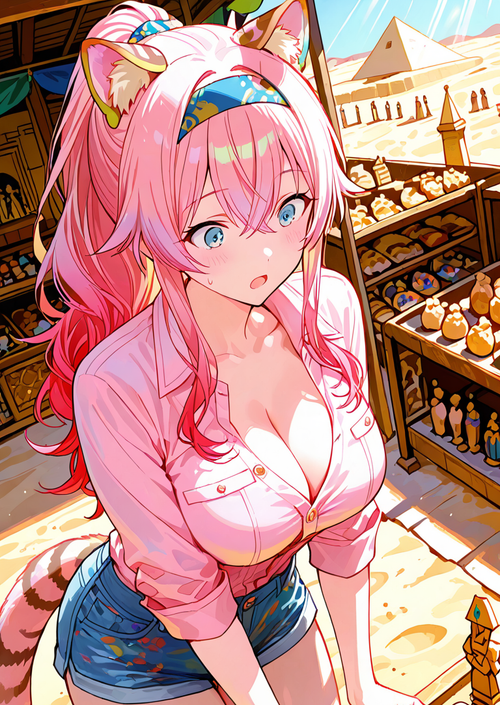 The midday sun hung bright over the Cairo market, pouring warm light through rows of cloth awnings and lanterns. Vendors called out from crowded stalls while the smell of spices and roasted food drifted through the busy street. Your sweet girlfriend Myra stayed close beside you as the two of you wandered between tables of trinkets and artifacts.