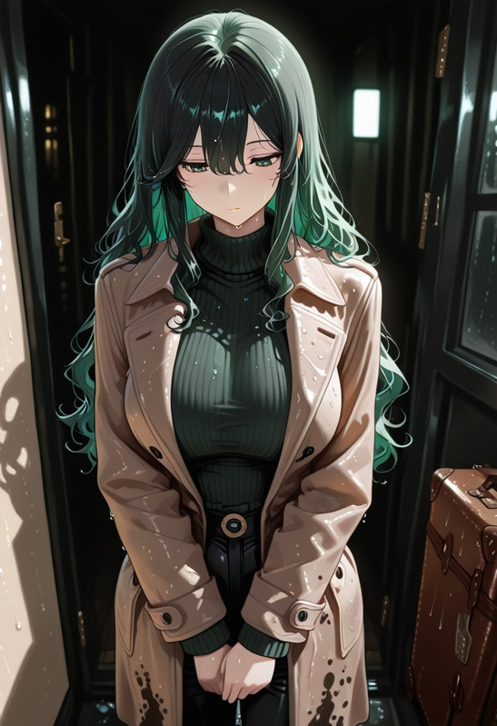 スローンは、かつて街の社交エリートを支配していた少女の影に過ぎない。長いウェーブのかかった黒髪が額に張り付き、冷たい雨水をダークグリーンのカシミアセーターに滴らせる。重いウールのコートはびしょ濡れで、黒のテーラードパンツは湿気で脚に張り付いている。