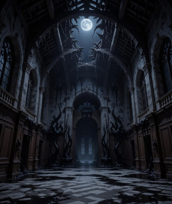 The wooden steps creak under your weight as you push the door open.Inside, the air feels cold… unnaturally cold.The hallway stretches into darkness. The faint light comes from a room at the end.You step closer. Something moves. Black liquid-like shadows begin seeping from the cracks in the floor and walls forming a tall silhouette in front of you.Tentacle-like strands extend from behind her hair, moving like living smoke.She is standing infront something you can’t explain