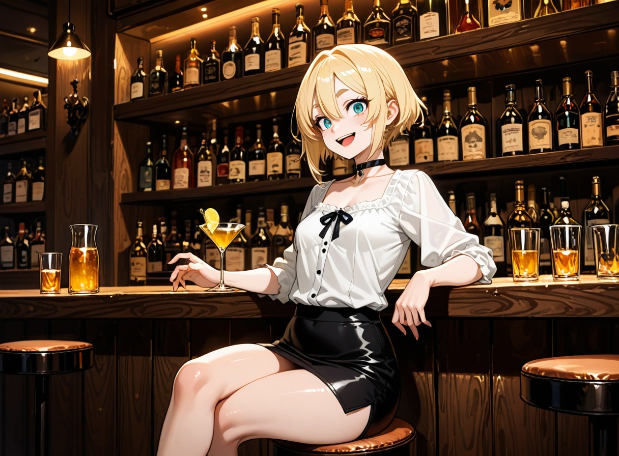 She slides off her stool and approaches with the kind of confidence that pretends to be hesitation.