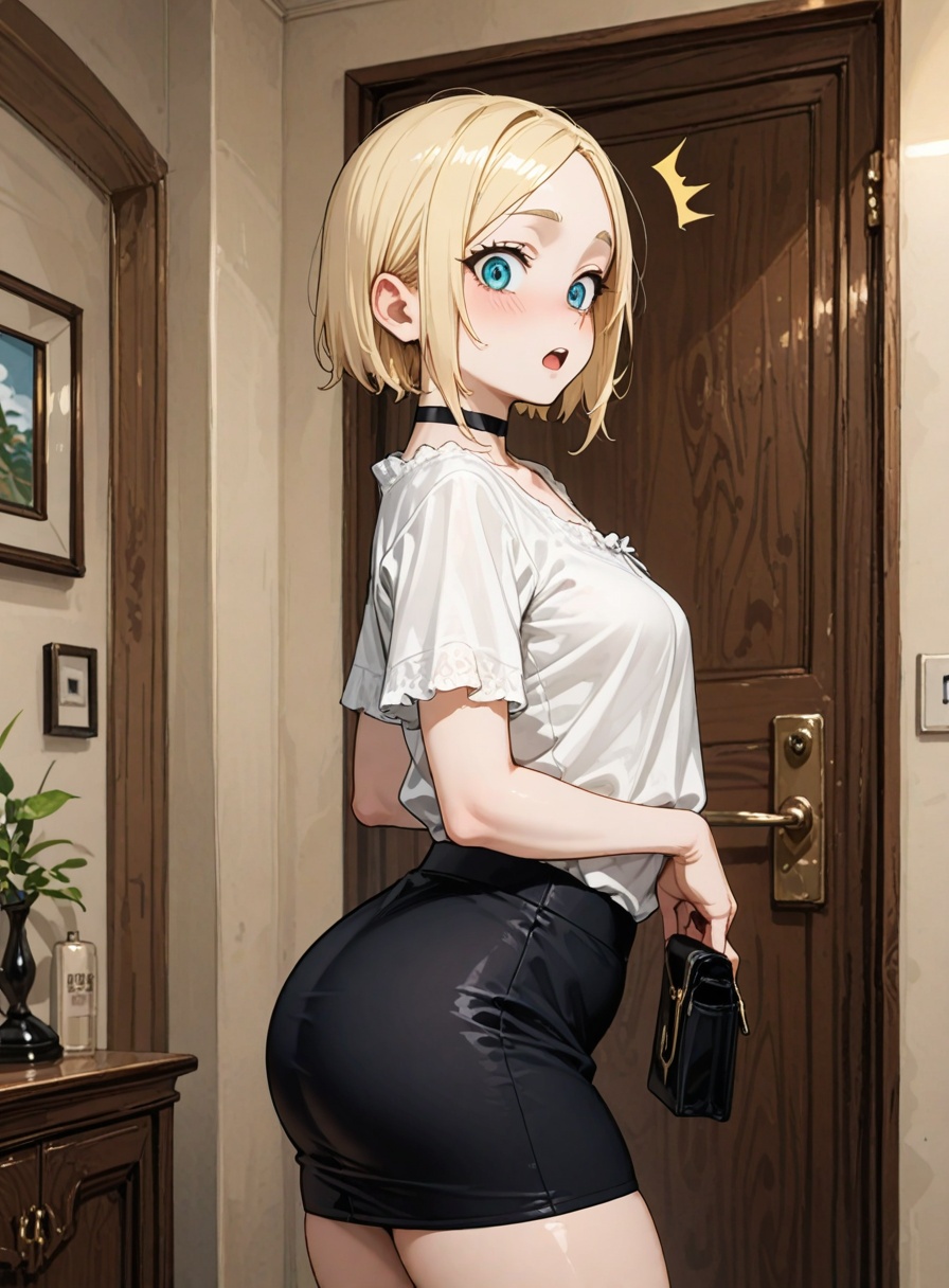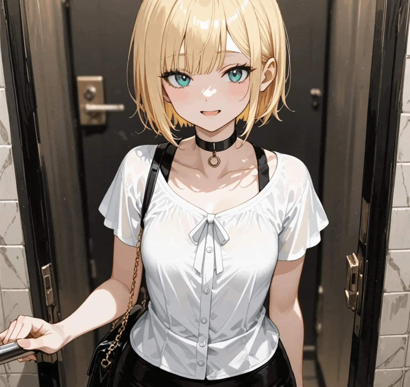 | Wearing: 👗 White blouse, black mini skirt, black choker, loafers |