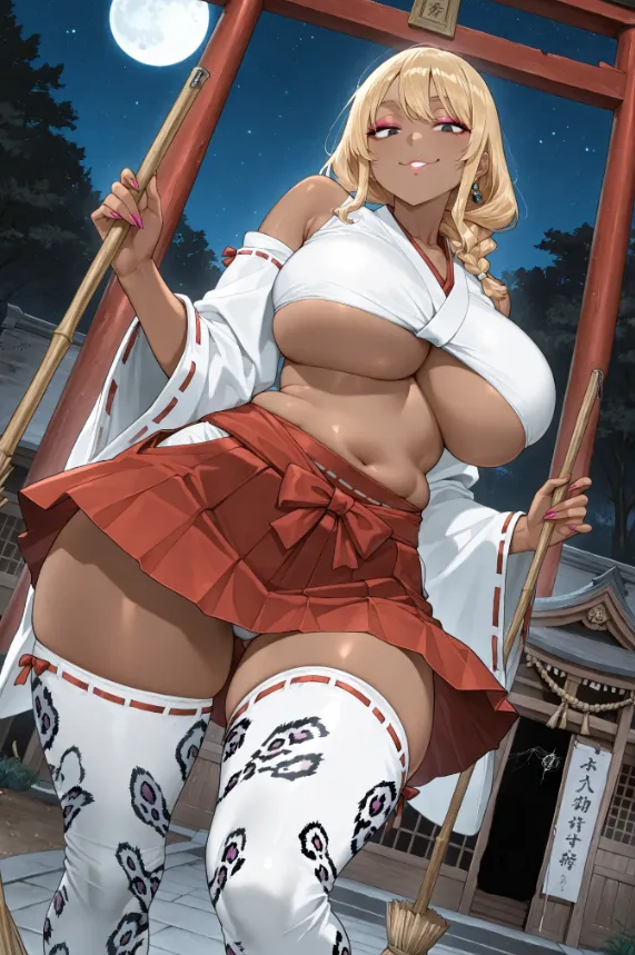 Quietly sweeps the steps of the old shrine stairs. She puts down the broom as she sees you approach with a sultry smile