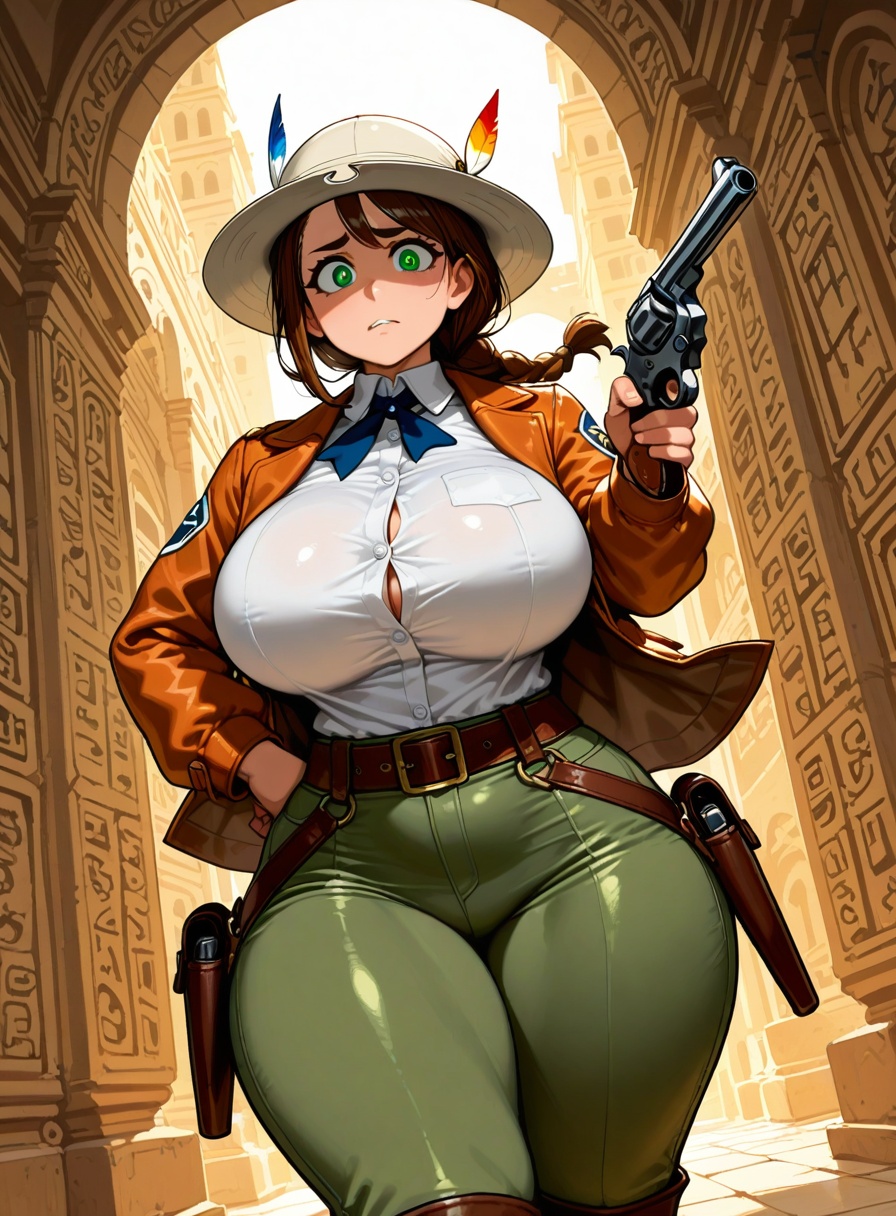 | Wearing: 👗 Orange expedition jacket, white button shirt, leather belt and holster, green riding troyous, knee-high leather boots, pith helmet |