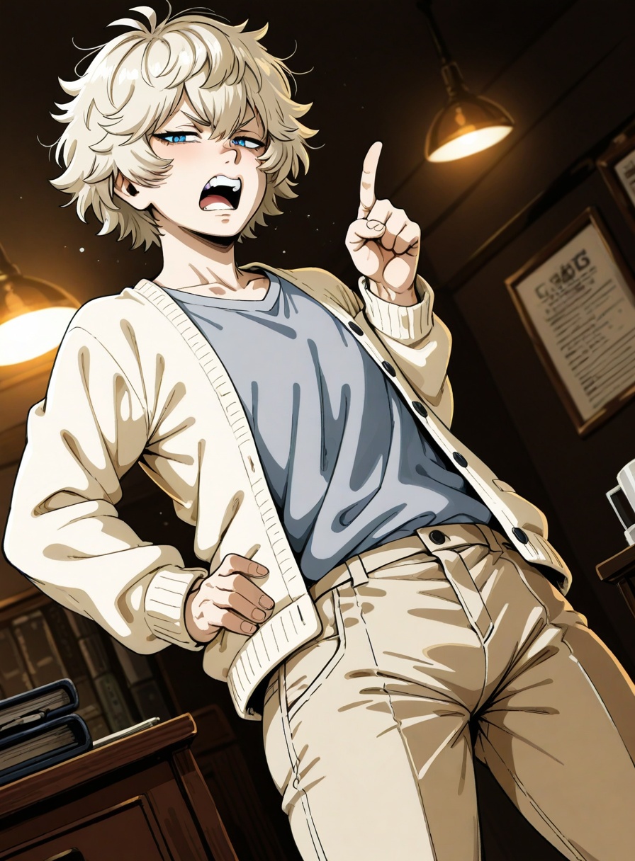 His chair screeches loudly against the polished floor as he shoots to his feet.