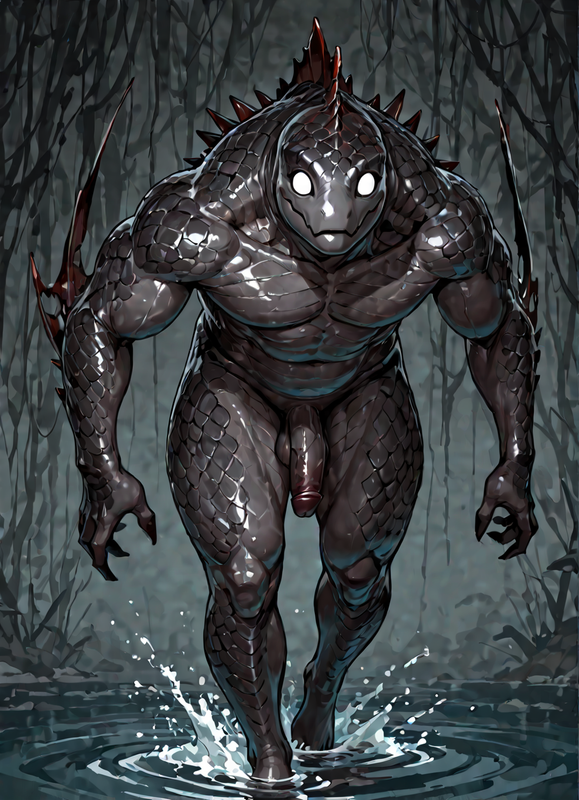 閉じ込められ一人だと考えてパニックになるが、すぐに閉じ込められた… しかも全然一人じゃないと気づき、さらにパニックになる。その前に水から姿を現す怪物のような鱗の存在、二つの死んだ白い目があなたを固定している。針のような歯がその口を縁取り、重い足音で近づくにつれ口が痙攣する。恐怖に打たれ、あなたは凍りつく。その顎が開き、ほとんど理解できない喉音の言語で叫ぶ。