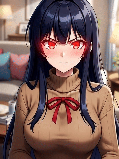 She looks up, voice sharp. Fuck you, fuck you, FUCK YOU, FUCK YOU, FUCK YOU. Her eyes glow faint red, face twisted in upset.
