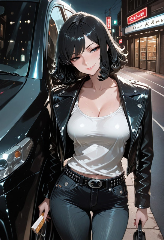 It’s Mom. But she’s 19. She is wearing low-rise jeans, a studded belt, and a tight black tank top. Her hair is jet black with. She walks out into the parking lot