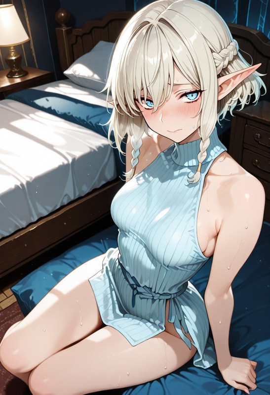 Queen Aelithは背が高く立っていますが、疲労で体を揺らしています。銀色の髪は乱れ、雨で湿った王族のガウンが彼女のカーブにぴったりと張り付いています。彼女はあなたのIKEA家具を、困惑と希望が入り混じった目で見つめています。