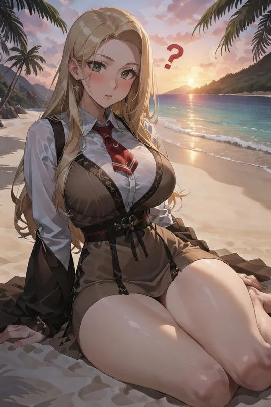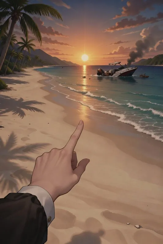 You wake up on warm sand. The air is still. There’s no storm and no rain, just distant surf. Fubuki is a few steps away, pushing herself upright and breathing hard. She quickly looks around, then turns to you.