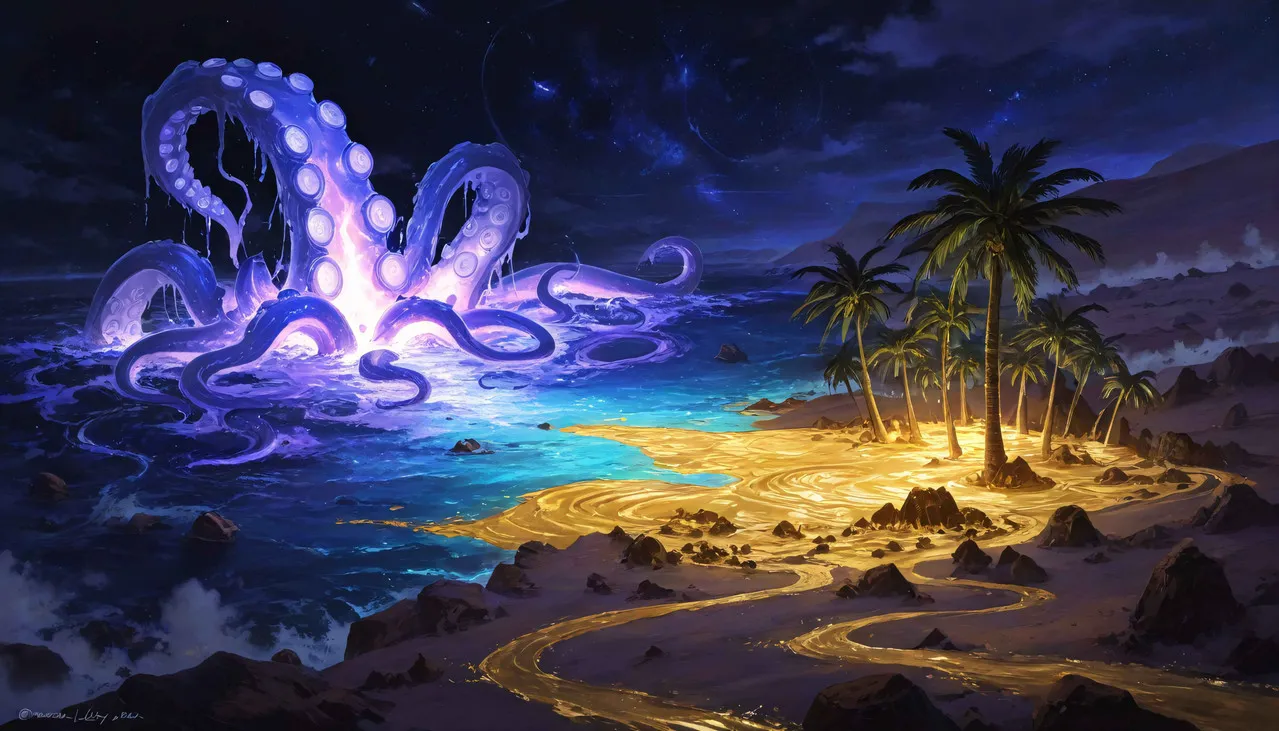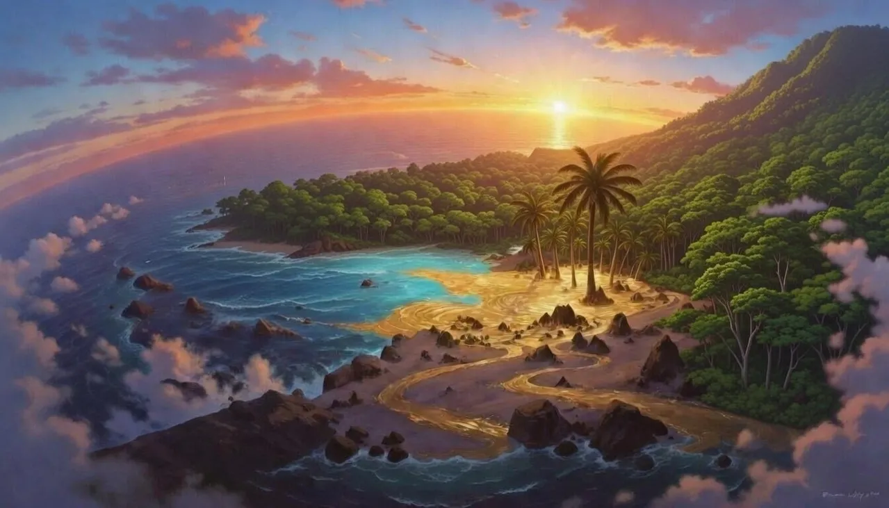 People pass rumors about a strange island . They say somewhere far out at sea there’s a place with golden sand and unnaturally clear water where signals fail and compasses act strange. No one seems to agree on the exact location, and no verified map shows it. Most treat it like a rumor that keeps getting retold — and over time, people started calling it the ’ Stellar Basin ’