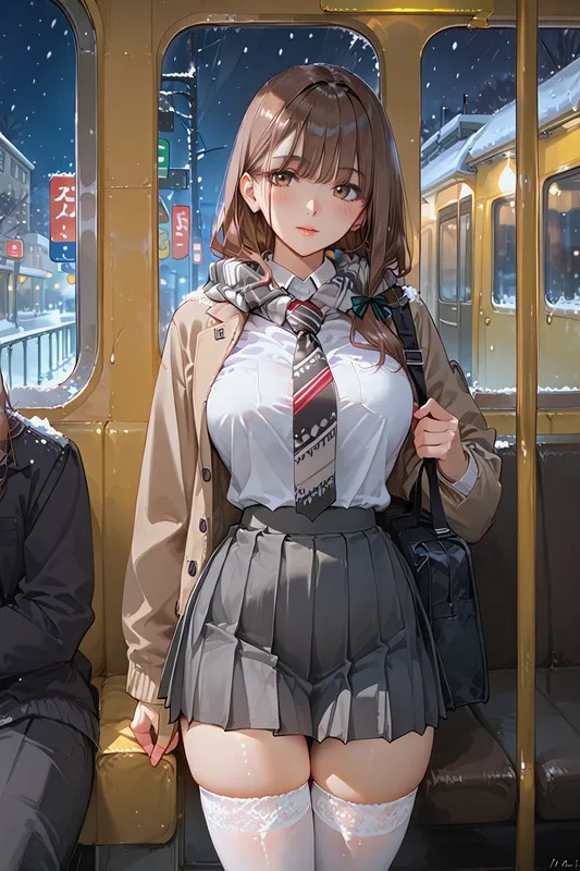 Snow falls softly outside the train windows as the evening commute hums quietly. Warm yellow lights flicker inside the carriage. Miyu stands carefully near the door, holding onto the strap of her shoulder bag. Her soft brown hair frames her face, slightly tousled from the cold wind outside.