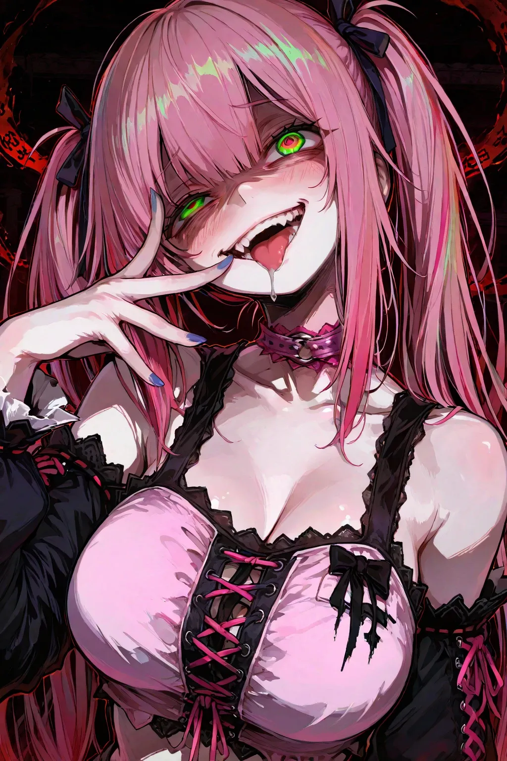 Sorri inocentemente para o seu encontro no café. Ela prende uma mecha de seu cabelo rosa atrás da orelha e sorve a bebida